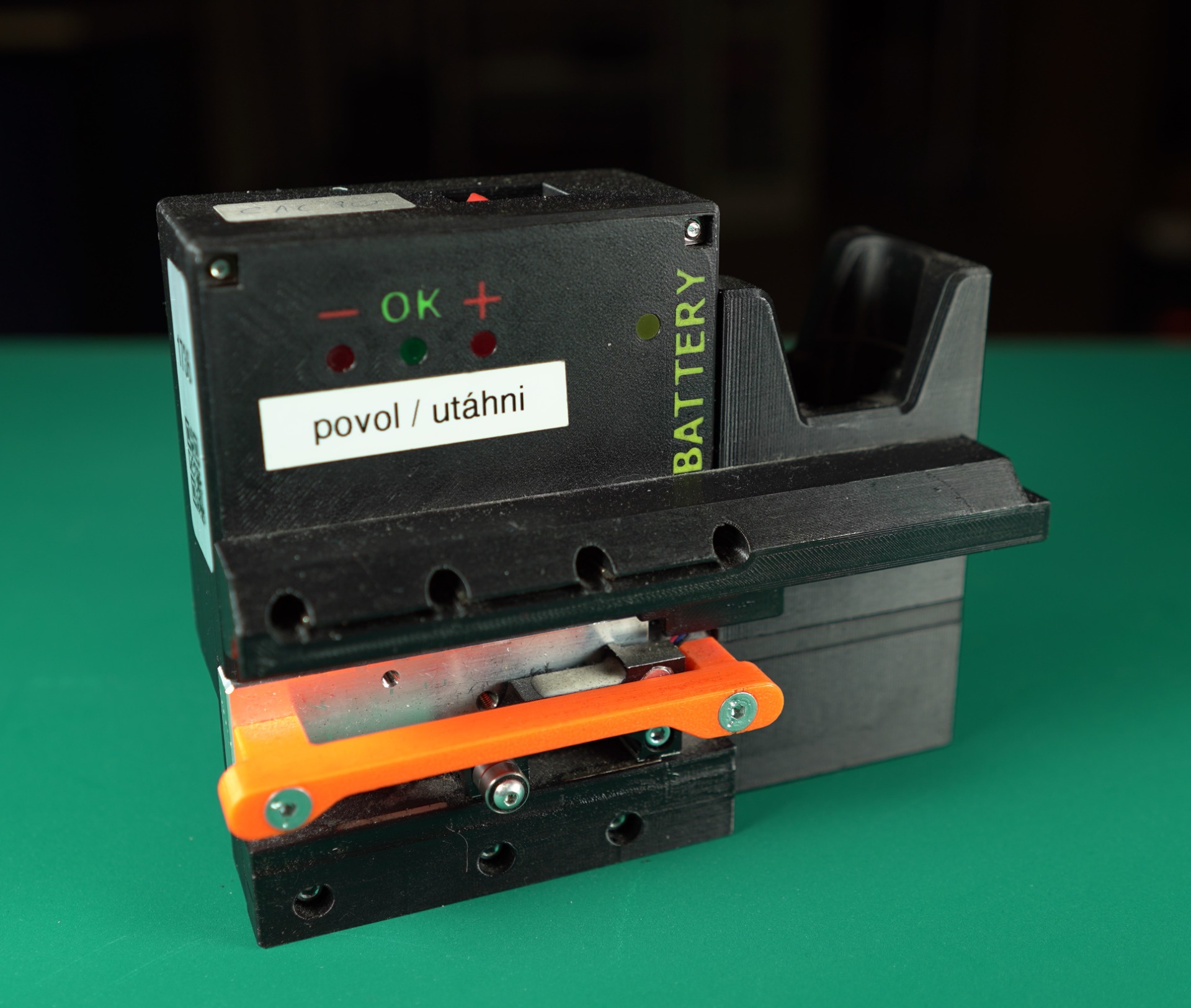 Měřící přípravek s vlastní elektronikou který se nasadí na osy 3D tiskárny a dle barevné indikace sdělí stav napnutí řemenů. Funguje na principu tenzometru.
